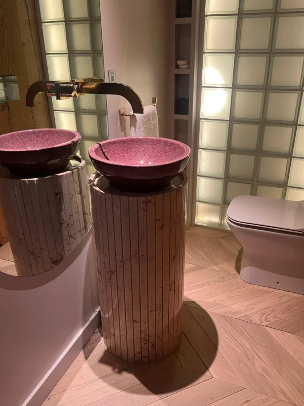 Un mármol con tonos rosas sutiles y vetas color vino, el mármol Rosalía posee una elegancia particular en tonos poco usuales. Especial para acompañar espacios cálidos.